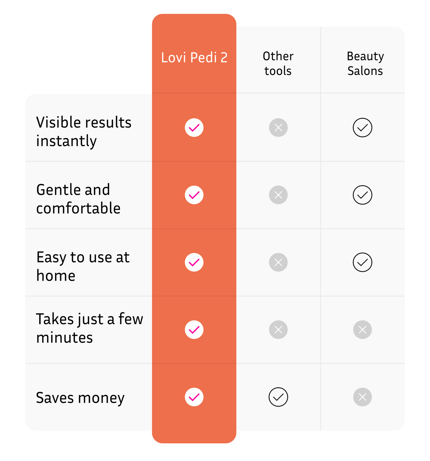 Alte Methoden wie Bimssteine und Handfeilen sind zeitaufwendig, belasten die Haut und führen selten zu den gewünschten Ergebnissen. Und Salons? Teuer und schwer in den Zeitplan zu integrieren.